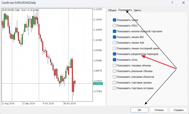 Смотрите, это можно сделать таким образом: кликните правой кнопкой мыши по свободному участку графика → выберите пункт «Свойства» → в диалоговом окне, во вкладке «Показывать» поставьте галочку: «Показывать разделители периодов» и нажмите «ОК»: