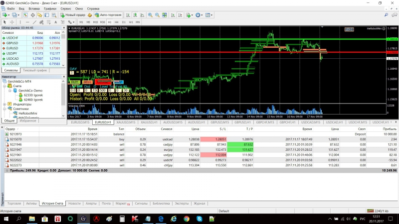 Привет!!! Сегодня уже сделал 5 сделок. 1 убыточная - 4 в плюсе. Общий доход 249 $. Скриншоты графиков по ссылке https://yadi.sk/d/Fo7BjcSd3Pqo4p. История счёта отдельным скрином. Точки входа делал как объясняли. Минусовая сделка на паре USD SHF - на 15 минутном прошёл сигнал на покупку, хотя часовой показывал продажу - пришлось сразу закрыть с минусом. Две сделки закрылись стопом - остальные вручную исходя из ситуации.