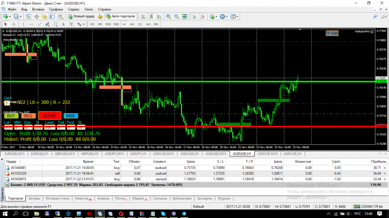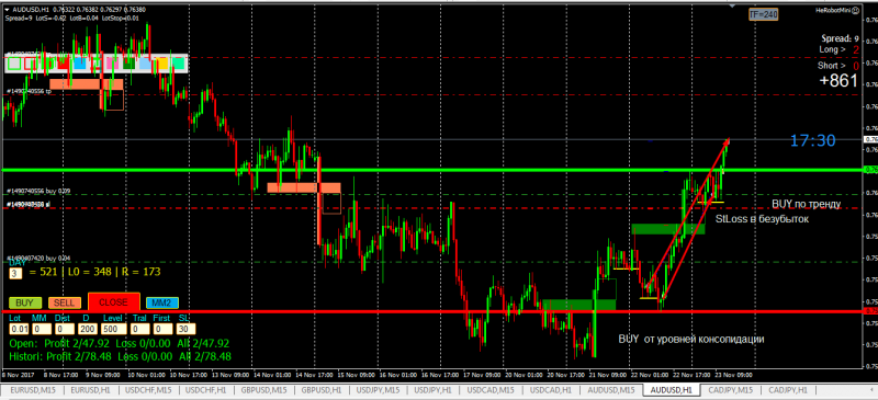 Две сделки по Австралицу закрылись по тейку. Две оставшиеся в безубытке. (перевёл после скрина) Суммарный тейк 1200 пунктов.(надеюсь пока)