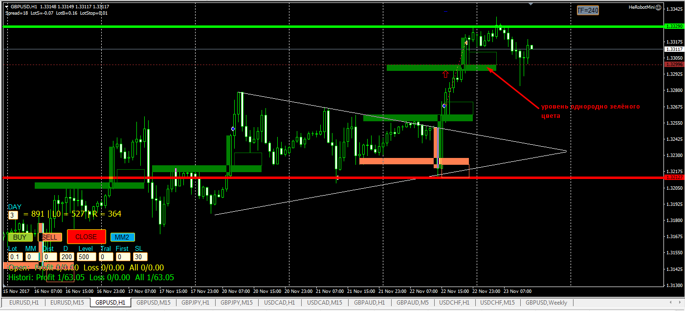 Алексей, а что это за уровень у Вас на ТФ Н1 двух оттенков зелёного: тёмно-зелёного и светло-зелёного? У меня нет ничего подобного: уровень однородно зелёного цвета.