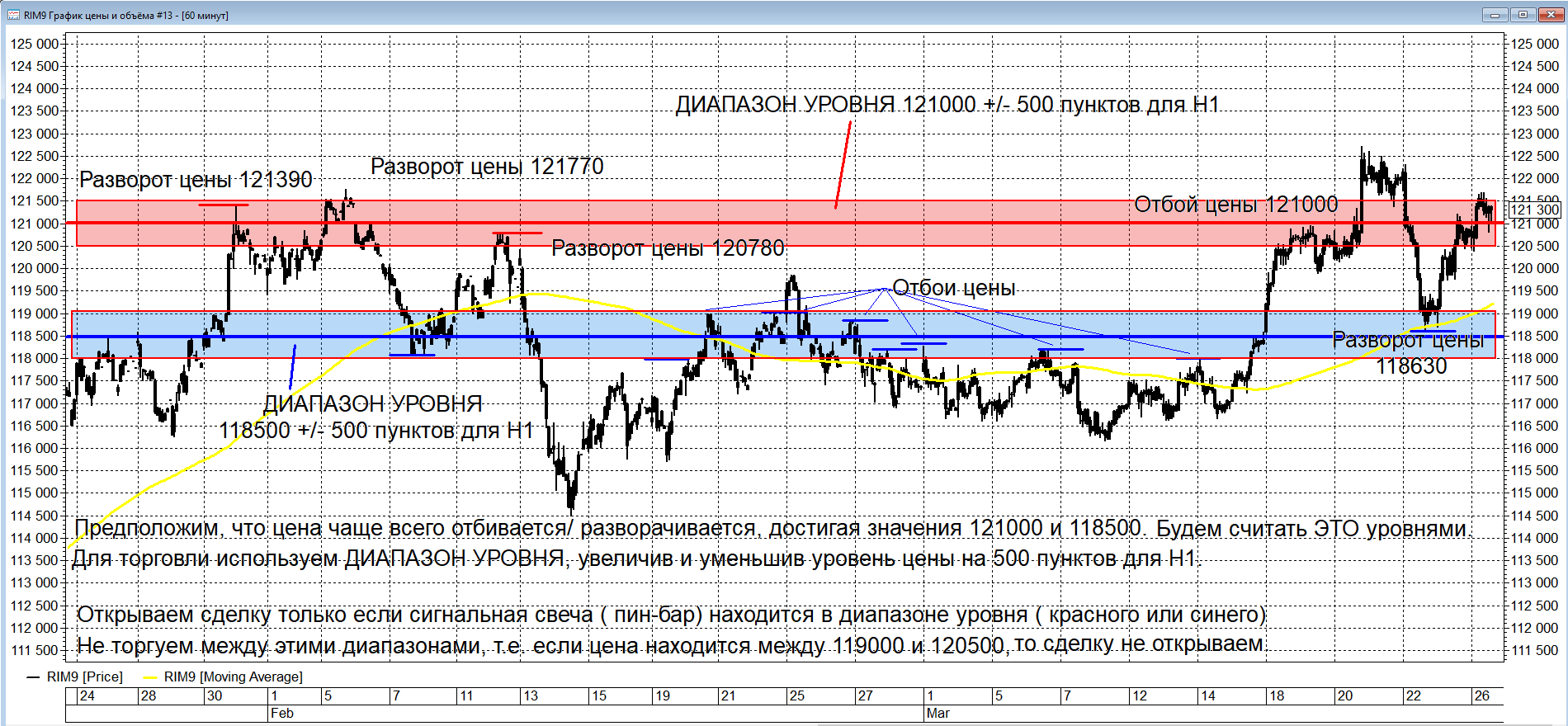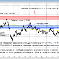 Для открытия сделки НЕОБХОДИМО, чтобы сигнальный пин-бар находился не только в диапазоне, он ещё должен быть на экстремуме волны ( если пин-бар в диапазоне уровня, но в боковике, то данный пин не рассматриваем в качестве сигнальной свечи). Выражение "ВОЙТИ ОТ УРОВНЯ" означает, что сделку нужно открыть в диапазоне ЭТОГО УРОВНЯ цены. Например, войти от уровня 121000, означает, что можно открыть сделку, если контрольная свеча на Н1 будет находиться в диапазоне 121000 +/- 500 пунктов ( 120500 - 121500) и являться экстремумом волны (быть на максимуме волны при ШОРТе или минимуме при ЛОНГе). Как вариант, допускается, чтобы сигнальная свеча касалась диапазона уровня.