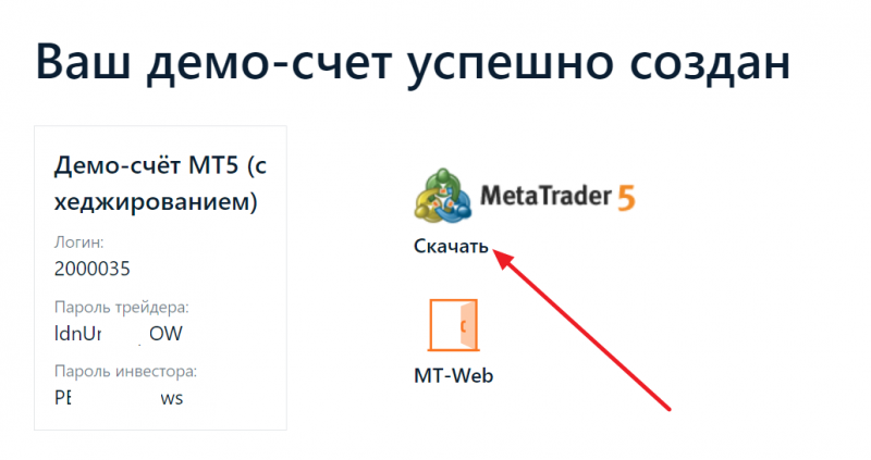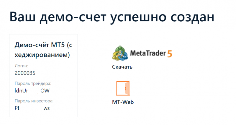 После этого появится окно с успешно созданным демо-счетом и данными (логином и паролем) для подключения