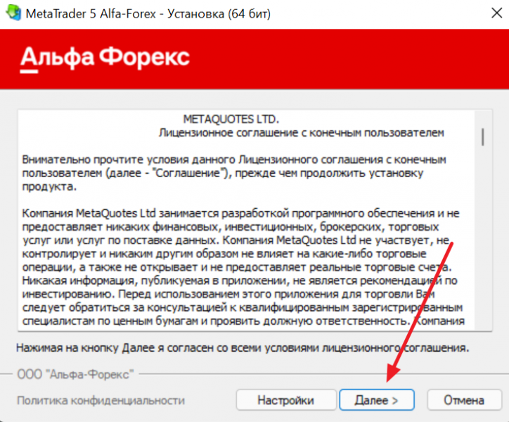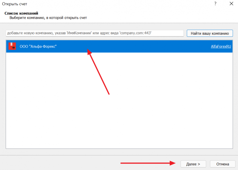 В диалоговом окне выбираем Альфа-Форекс и нажимаем «Далее“