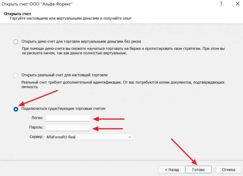 Далее выбираем пункт «Подключиться существующим торговым счетом» → вводим логин и пароль трейдера → нажимаем «Готово»