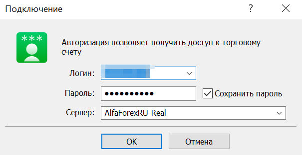 Далее в окне вводим Логин и Пароль от демо-счета и нажимаем ОК