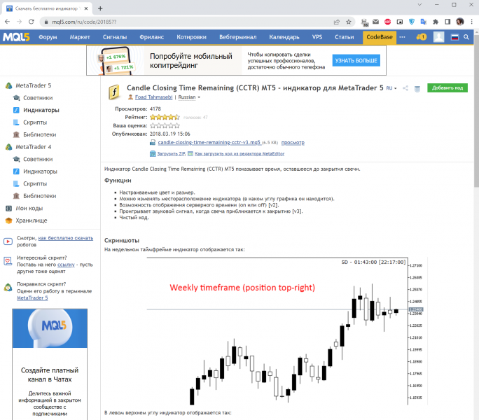 Индикатором, показывающим оставшееся время до закрытия свечи на любом ТФ (Тайм Фрейме), пользуюсь уже много лет, работая на Форексе (уже 10 лет) на платформе МТ4. И без него не могу. Удобнейшая "штучка"!!!