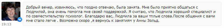 «Добрый вечер, извиняюсь, что поздно отвечаю, была занята. Мне было приятно общаться с Людмилой, она очень помогла мне своей поддержкой. Я считаю, что Людмила — хороший специалист и по совместительству психолог. Благодарю вас, Людмила за ваши теплые слова. После общения с вами мне стало легче. Возможно, скоро я вернусь к занятиям у Анны Зольд».