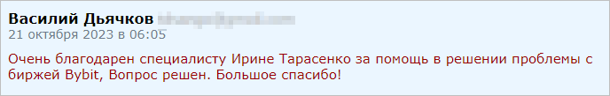 Огромное спасибо Ирине Тарасенко за экстренную помощь по спасению моих денежных средств при срочном уходе из Binance. Сам бы ни за что не справился, тем более, что уходить из Binance надо было срочно. Ирина - очень грамотный специалист, на  которого можно положиться в трудную минуту !