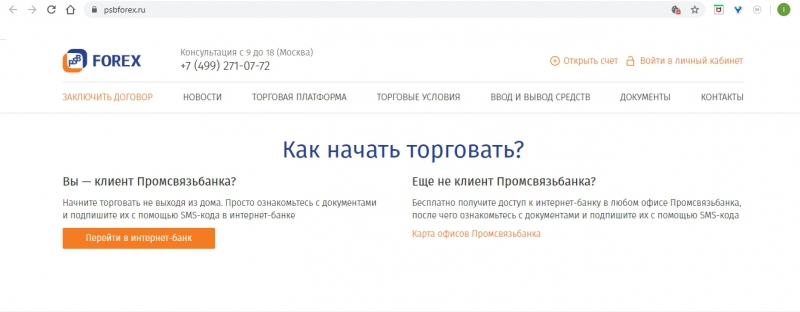 - Открытие торгового счета — удаленно для клиентов Промсвязьбанка, если Вы еще не клиент будет необходимо посетить один из его офисов