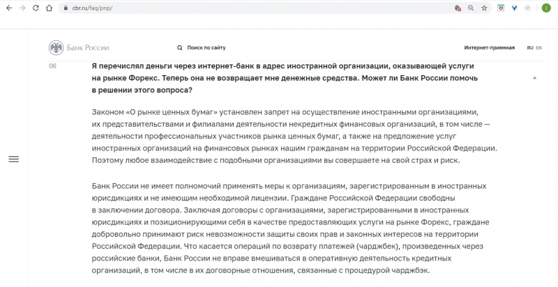Заключая договоры с организациями, зарегистрированными в иностранных юрисдикциях и позиционирующими себя в качестве предоставляющих услуги на рынке Форекс, граждане добровольно принимают риск невозможности защиты своих прав и законных интересов на территории Российской Федерации...»