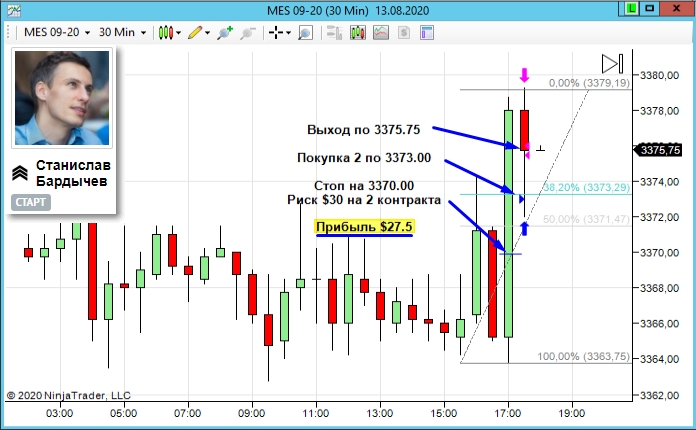 «Уровень стопа и выход из позиции не по стратегии "»30-мин". Прибыль могла бы быть выше, т.к. изначально тейк планировался под максимум слева (его достали бы). Но, когда наблюдаешь за сделкой и видишь, что цена замедляется и начинает откатывать, то решаешь забрать прибыль со стола» — пишет Станислав Бардычев.