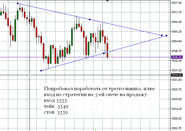 Инструмент S&P 500 мини. Вошла в сделку по восходящему тренду уровень коррекции ½ вход по цене 3804,25. Стоп поставила чуть ниже уровня коррекции ½ по цене 3797, тейк чуть ниже максимального движения тренда по цене 3805,5.