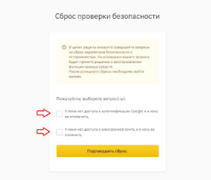 Если нет возможности войти даже в аккаунт, а так может случиться, если потерян не только доступ к почте, но и пароль или 2FA, то нужно запустить процедуру сброса прямо на странице входа на биржу и следовать инструкциям тех. поддержки.