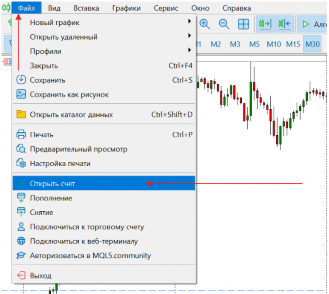 В верхнем меню терминала выбираем «Файл», далее в выпавшем меню выбираем «Открыть счет» и нажимаем «Далее»: