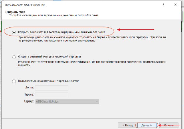 Выбираем «Открыть демо-счет для торговли виртуальными деньгами без риска» — «Далее»: