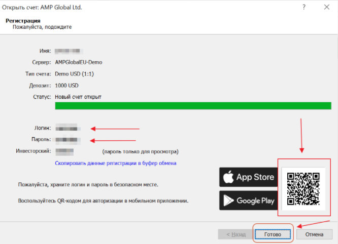 Когда у Вас на телефоне установлен терминал МТ5, то если через сканер штрих-кода отсканируете QR-код (большой квадратик) — в мобильной версии МТ5 у Вас автоматически подключится данный демо-счет без лишних телодвижений.
