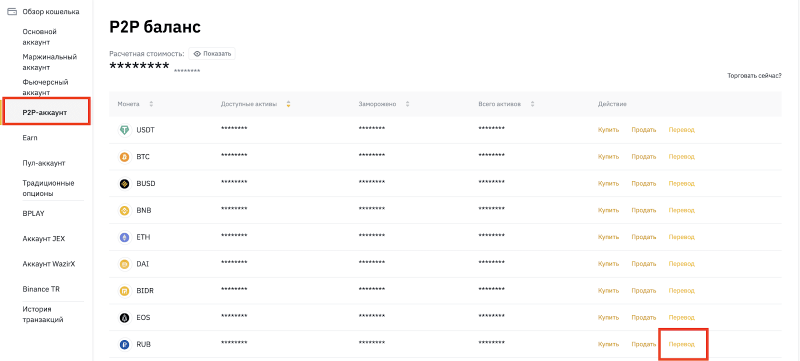 1) Для начала, переведите ваш рублевый баланс на P2P кошелек. Выберите в левом меню «P2P-аккаунт», затем «RUB» и «Перевод»: