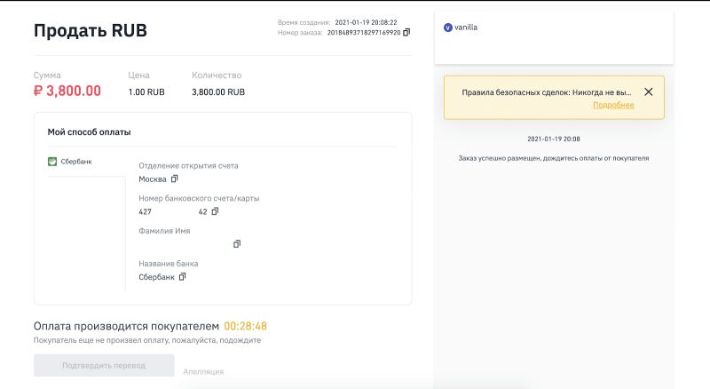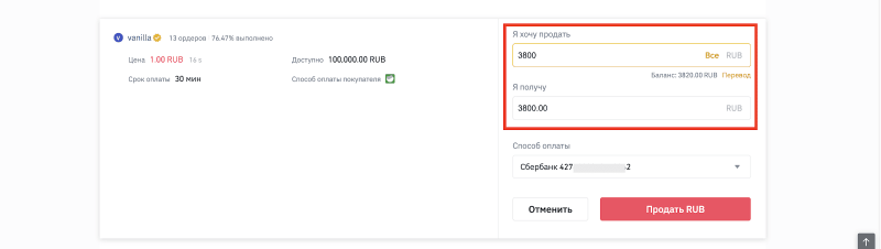 6) Дождитесь оплаты от покупателя. Обратите внимание, что ваш RUB баланс заморожен на время сделки, по такому же принципу, как и сделки с криптовалютой (BTC, USDT и т.д.)