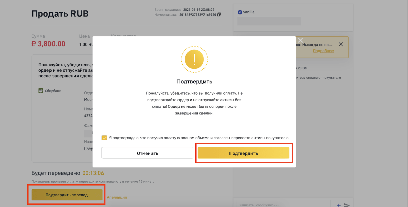 На данном этапе обязательно проверьте поступление денежных средств на вашу карту. Если платеж получен, подтвердите перевод и завершите сделку.