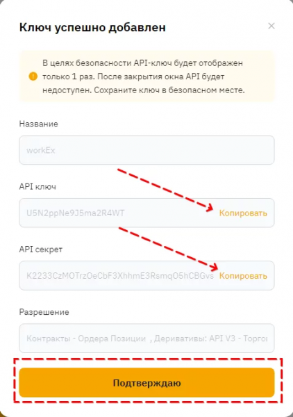 Скопируйте или запишите Ваш секретный ключ. После закрытия окна увидеть ключ «API Секрет» еще раз вы не сможете. «API ключ» всегда будет доступен в личном кабинете. После сохранения API нажмите на кнопку «Подтверждаю». На этом процесс создания ключей окончен.