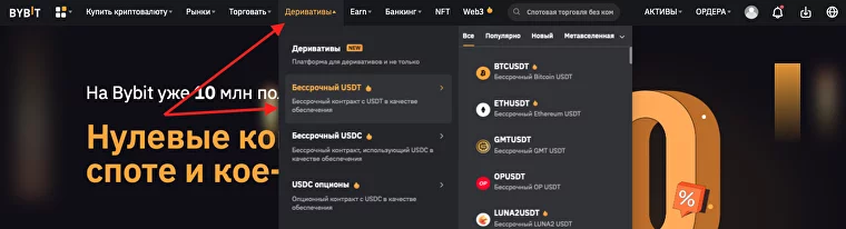 Для этого на сайте биржи зайдите в раздел «Бессрочные USDT» и выберите нужный инструмент.