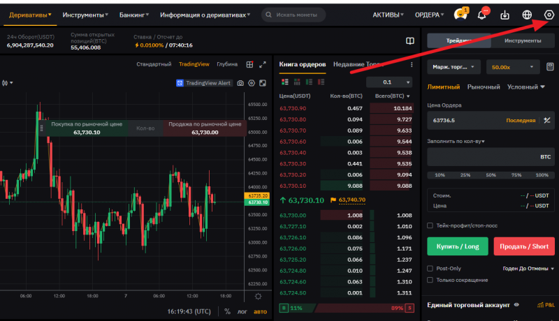 На странице инструмента перейдите в настройки, нажав по шестеренке. Допустим, Вы выбрали BTCUSDT.
