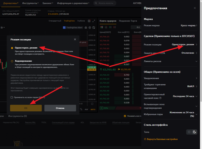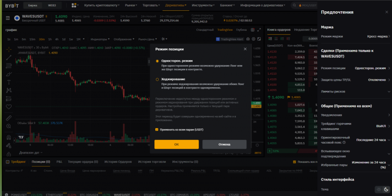 Во вкладке «Трейд» нажмите на «Режим позиции» и выберите «Односторонний режим». Затем нажмите «ОК». Режим хеджирования отключен.