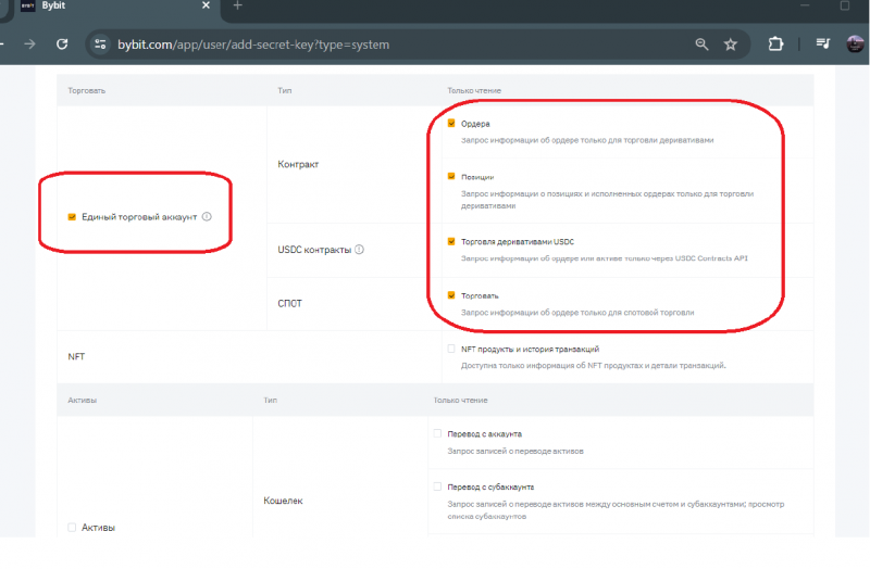 Примечание: при включенном разрешении «Торговать» для спотового рынка, Вы сможете использовать одни и те же ключи API для подключения к спотовой площадке к спотовой площадке и фьючерсам.