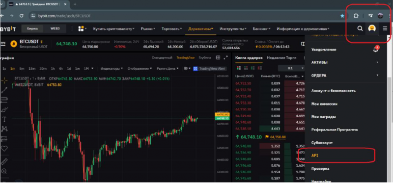 Войдите в личный кабинет на бирже Bybit. Наведите курсор на значок профиля в верхней части меню. Из выпадающего списка кликните по пункт «API».