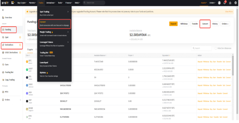 Чтобы улучшить торговый опыт и удобство для пользователей, трейдеры могут конвертировать свои монеты непосредственно на Bybit для любой из криптовалют, поддерживаемых на Спотовом, Единый торговый аккаунт, Деривативном, (или Инверсном Деривативном) аккаунте или функции конвертации аккаунта Финансирования.