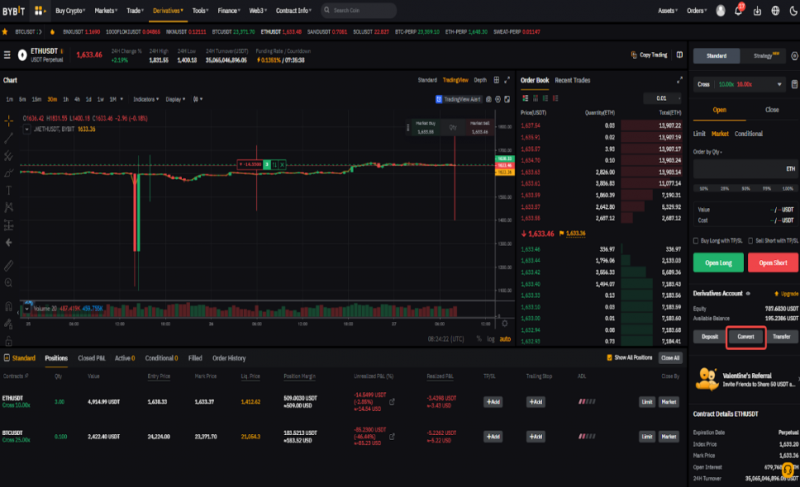 Ещё можно перейти к столбцу Активы в правой части страницы торговли деривативами и нажать Конвертация.