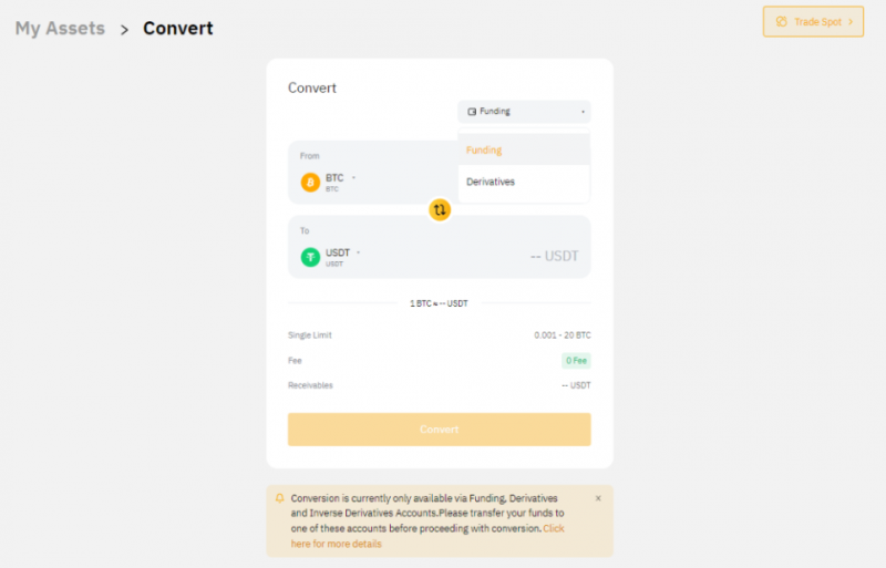 1. Конвертация в настоящее время доступна только через Спотовые, Единый торговый аккаунт, Деривативные, Инверсные Деривативные аккаунты и аккаунты Финансирования. Переведите свои средства на один из этих аккаунтов, прежде чем приступать к конвертации.