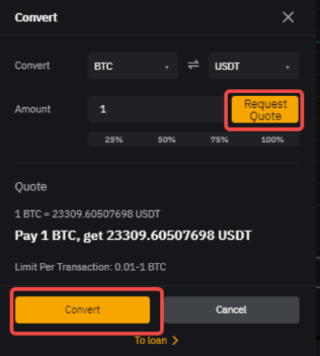 Если вы выполняете конвертацию на странице торговли деривативами, сначала необходимо нажать Получить котировку для просмотра курса обмена.