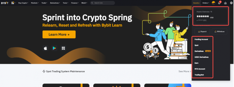 Шаг 1. Нажмите мышкой на Активы в правом верхнем углу главной страницы Bybit.
