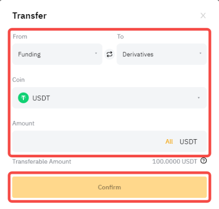 На странице перевода можно переводить USDC между спотовым, деривативным USDC и аккаунтом финансирования.