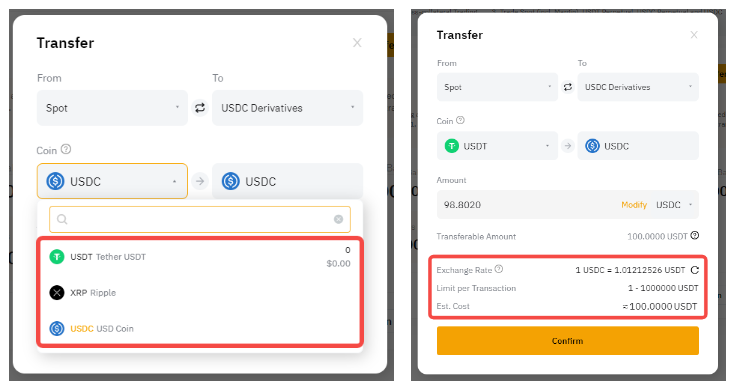 В спотовом аккаунте можно конвертировать USDT или другие монеты в USDC по фактическому обменному курсу, а затем переводить их непосредственно на деривативный USDC аккаунт.