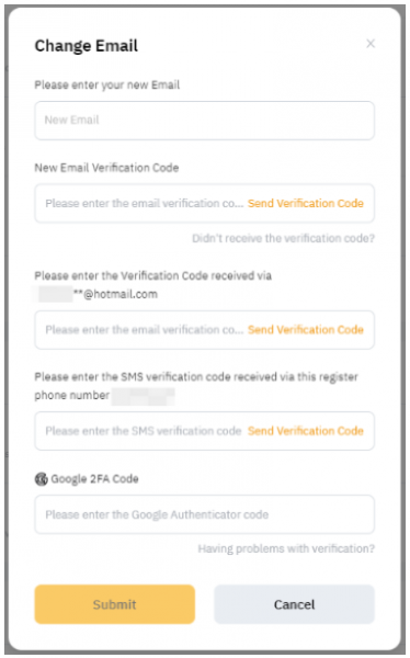 Шаг 4: Введите необходимую информацию, а именно новый адрес электронной почты, код подтверждения электронной почты, код подтверждения со старого адреса электронной почты, код из SMS-сообщения и код Google Authenticator.