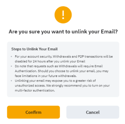 — Обратите внимание, что многие запросы, такие как запрос на вывод средств, требуют подтверждения по электронной почте. После удаления адреса электронной почтой вы можете столкнуться с ограничениями на вывод средств в будущем.