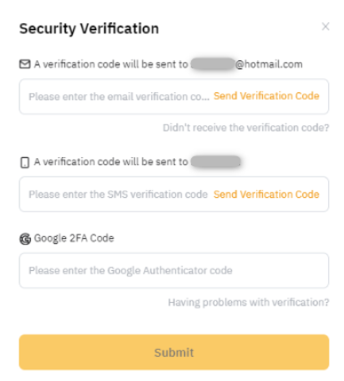Шаг 4: Введите необходимую информацию, такую как код подтверждения с электронной почты, код из SMS-сообщения и код Google Authenticator. Если вы отправили заявку с неправильным кодом, старый код станет недействительным. Вам придётся запросить код повторно и ввести новый адрес электронной почты, код из SMS-сообщения и код Google Authenticator.