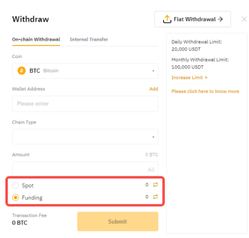 Вывод средств производится непосредственно через спотовый или финансовый аккаунт. Если вы хотите вывести активы с другого аккаунта, для начала переведите активы с этого аккаунта на Спотовый аккаунт или Финансовый аккаунт с помощью кнопки Перевести.