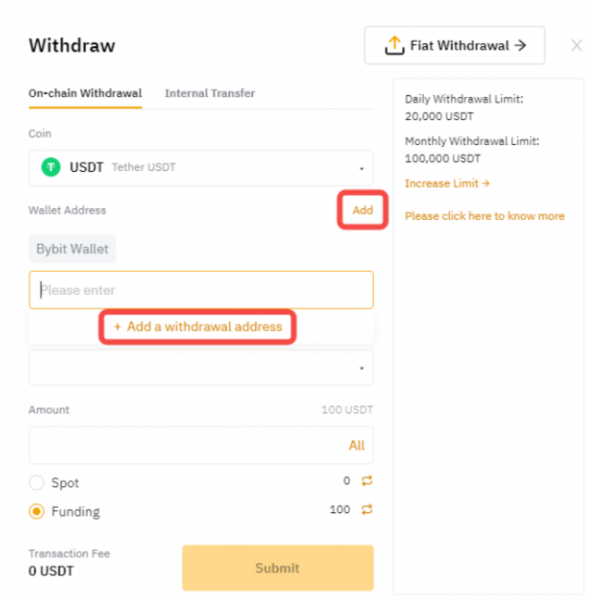 б) Добавьте новый адрес кошелька для вывода средств в Адресную книгу кошельков вывода на Bybit.