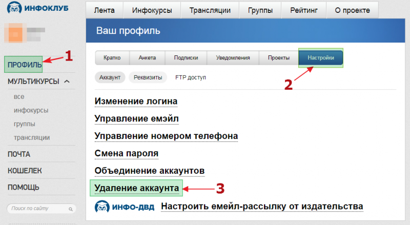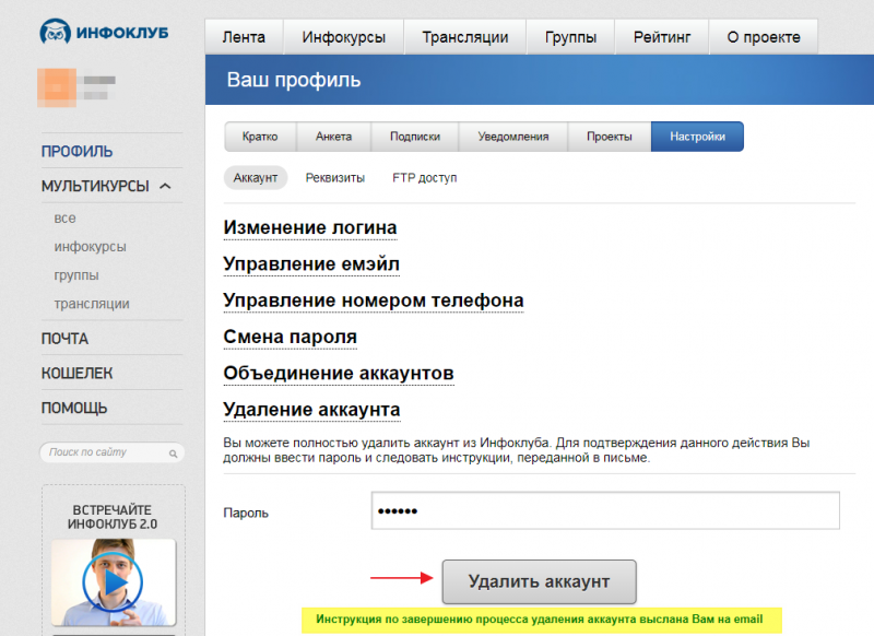Удалить свой аккаунт в Инфоклубе можно таким образом: