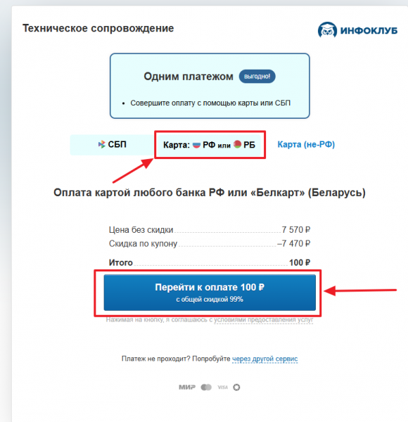 При оплате российской картой или картой «Белкарт» Беларусь убедитесь, что выбрана правильная платежная система «Карта: РФ или РБ» и нажмите на кнопку «Перейти к оплате»: