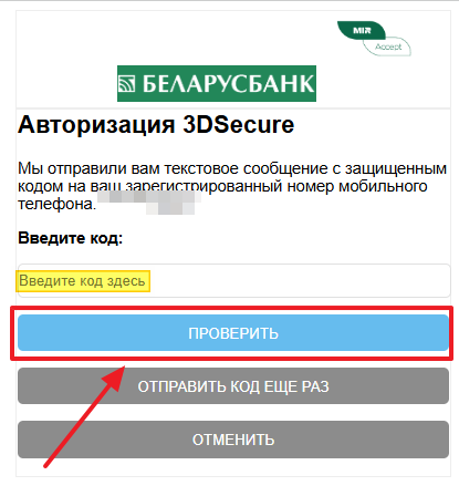 Далее при оплате картой, возможно будет необходимо ввести подтверждающий код и нажать кнопку «Проверить»: