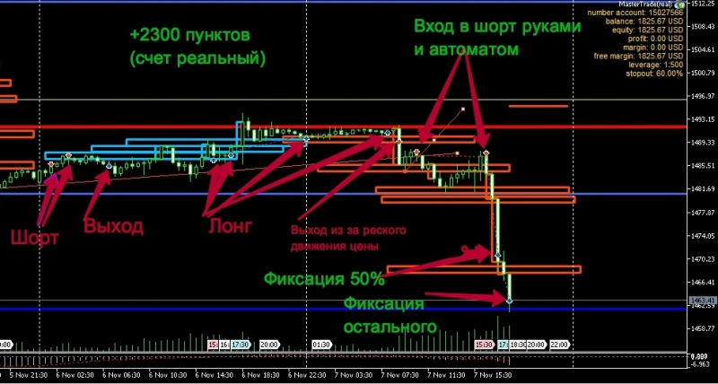 На следующий день цена долго топталась и появилось резкое движение вниз, я решил зафиксировать позицию с небольшим плюсом. Затем решил взять маленький объем на продажу, цена пошла еще ниже, и на откате после формирования двух красных уровней роботом и точкой входа роботом я добавил хороший объем на продажу. После чего был резкий импульс вниз. Зафиксировал сначала 50%, затем у цели зафиксировал остальное.
