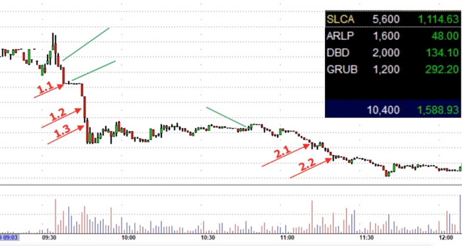 Серия сделок в шорт на акциях SLCA принесла прибыль +1114,63$, также в этот день были и другие прибыльные сделки, которые в совокупности принесли +1588,93$ к депозиту: