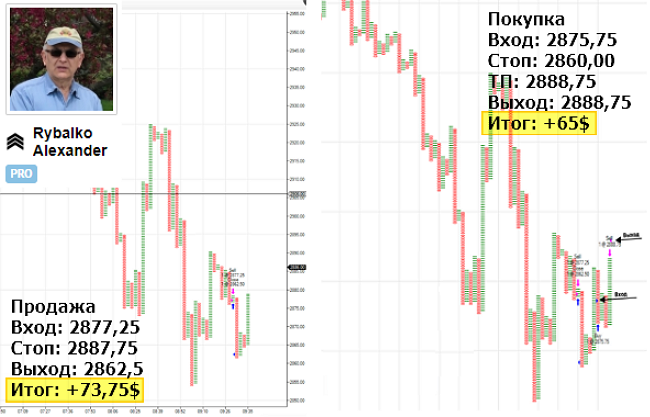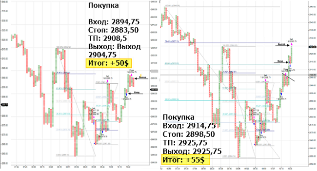 Продал по сигналу с понижающимися вершинами. В сделке был 55 секунд. Один микролот +$73,75