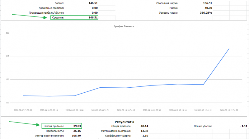 результат составил +40% к депозиту за 10 сентября (в первый день работы на этом счете).