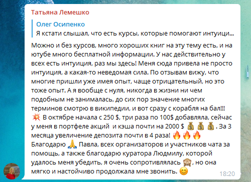 Участники делятся своими мыслями и результатами, обсуждают акции компаний для дальнейших инвестиций, помогают друг другу в решении текущих вопросов и дружно идут к общей цели — финансовой свободе!