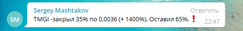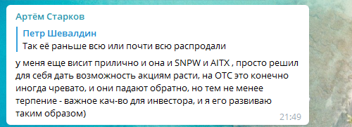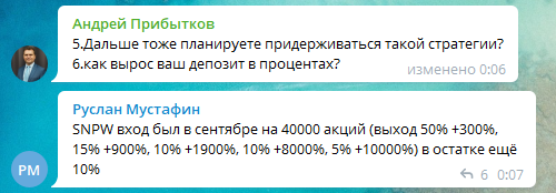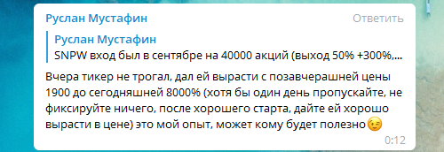 «SNPW вход был в сентябре на 40000 акций (выход 50% +300%, 15% +900%, 10% +1900%, 10% +8000%, 5% +10000%) в остатке ещё 10%»